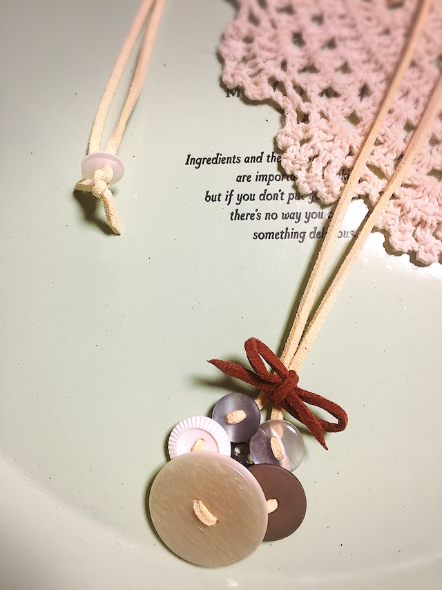 紐の長さ約85cm。やや長めのペンダントです。 一つだけ下がる形でブルーボタンを置き、その他の小さなボタンたちはお好きな位置に移動して楽しめます。