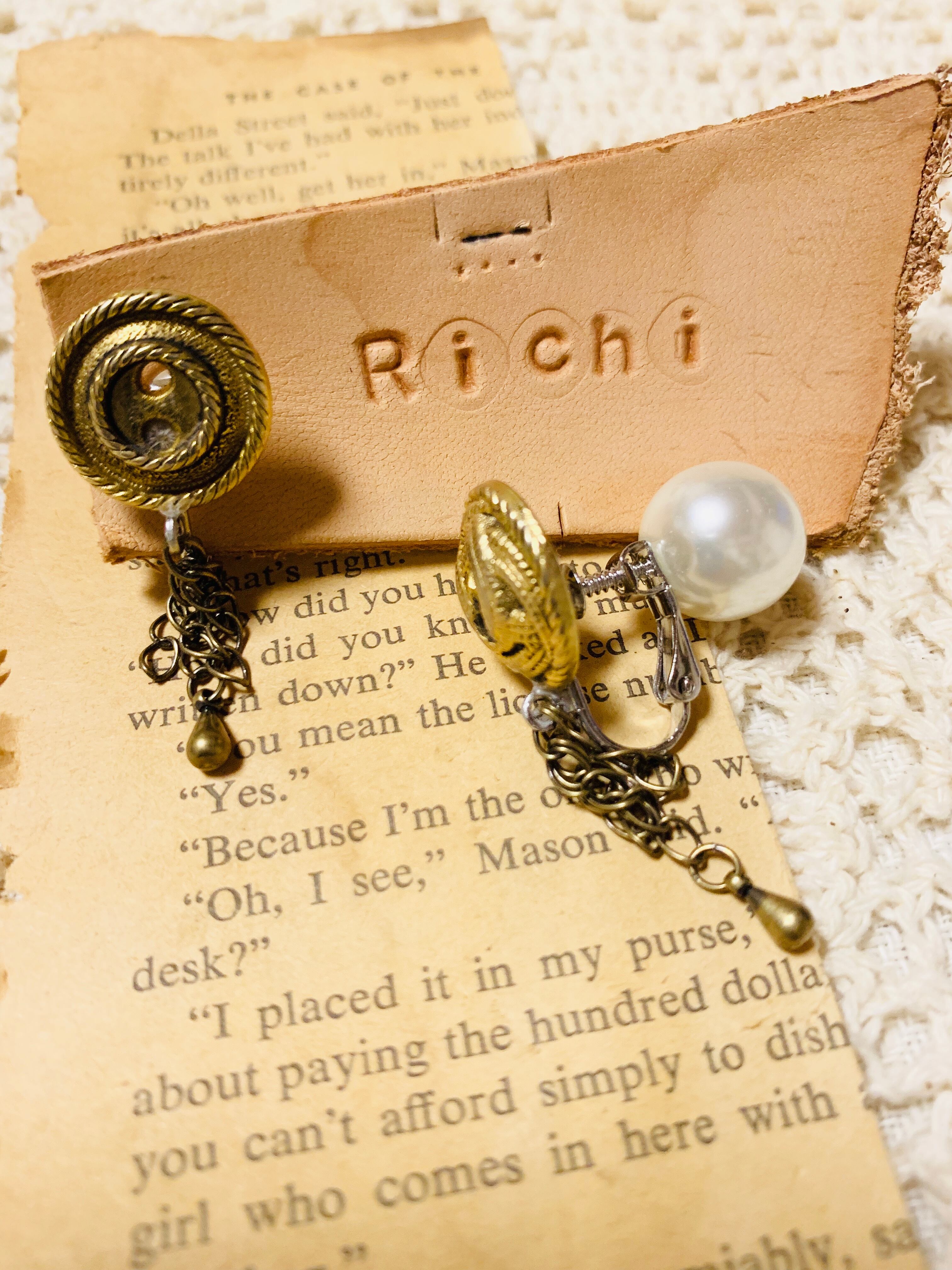 落ち着いたゴールドレトロボタンが、左右アシンメトリーに並び^_^アンティーク風チェーンがゆらゆら揺れる。後ろのネジが大きめパールになっています✨
