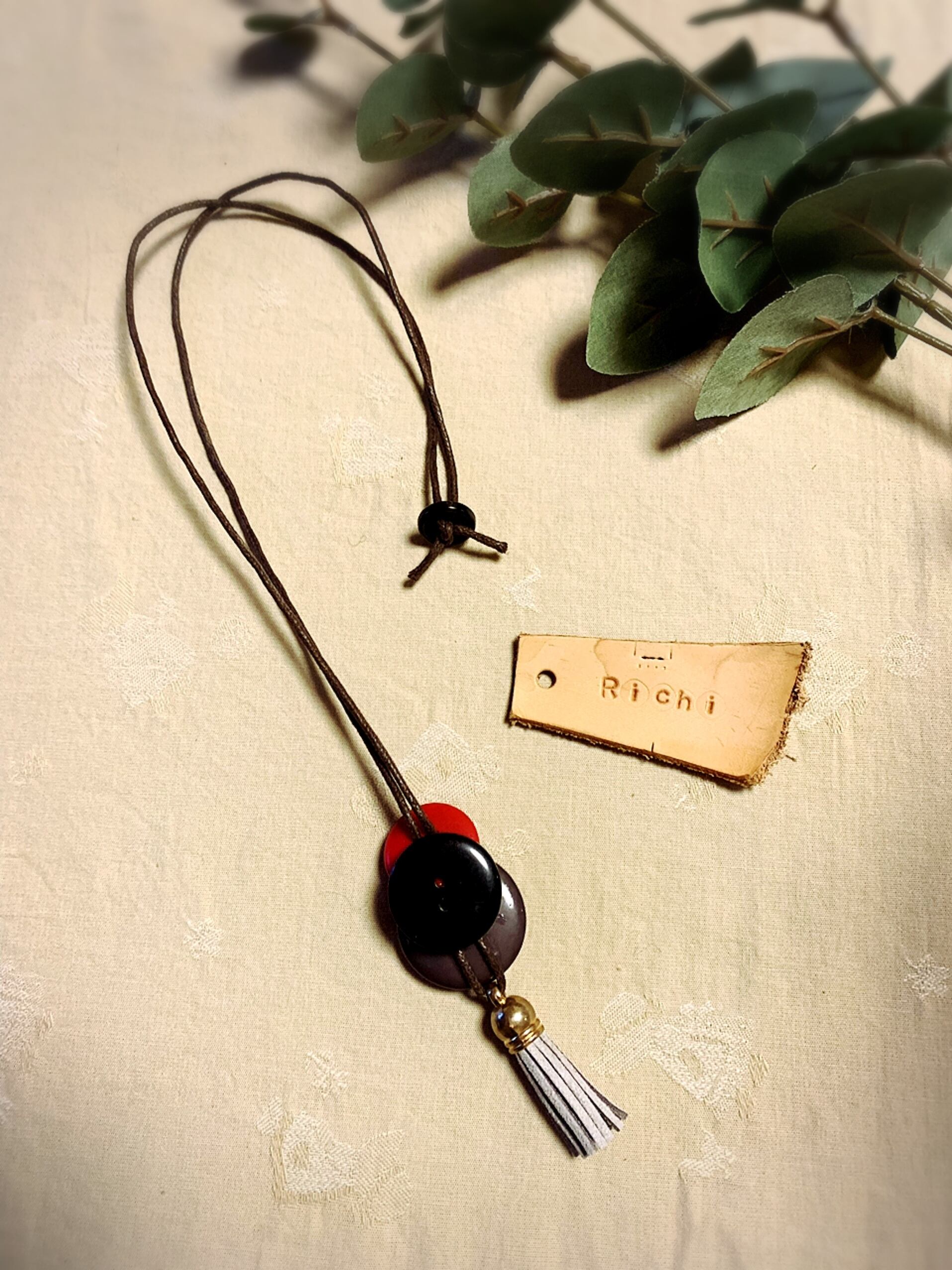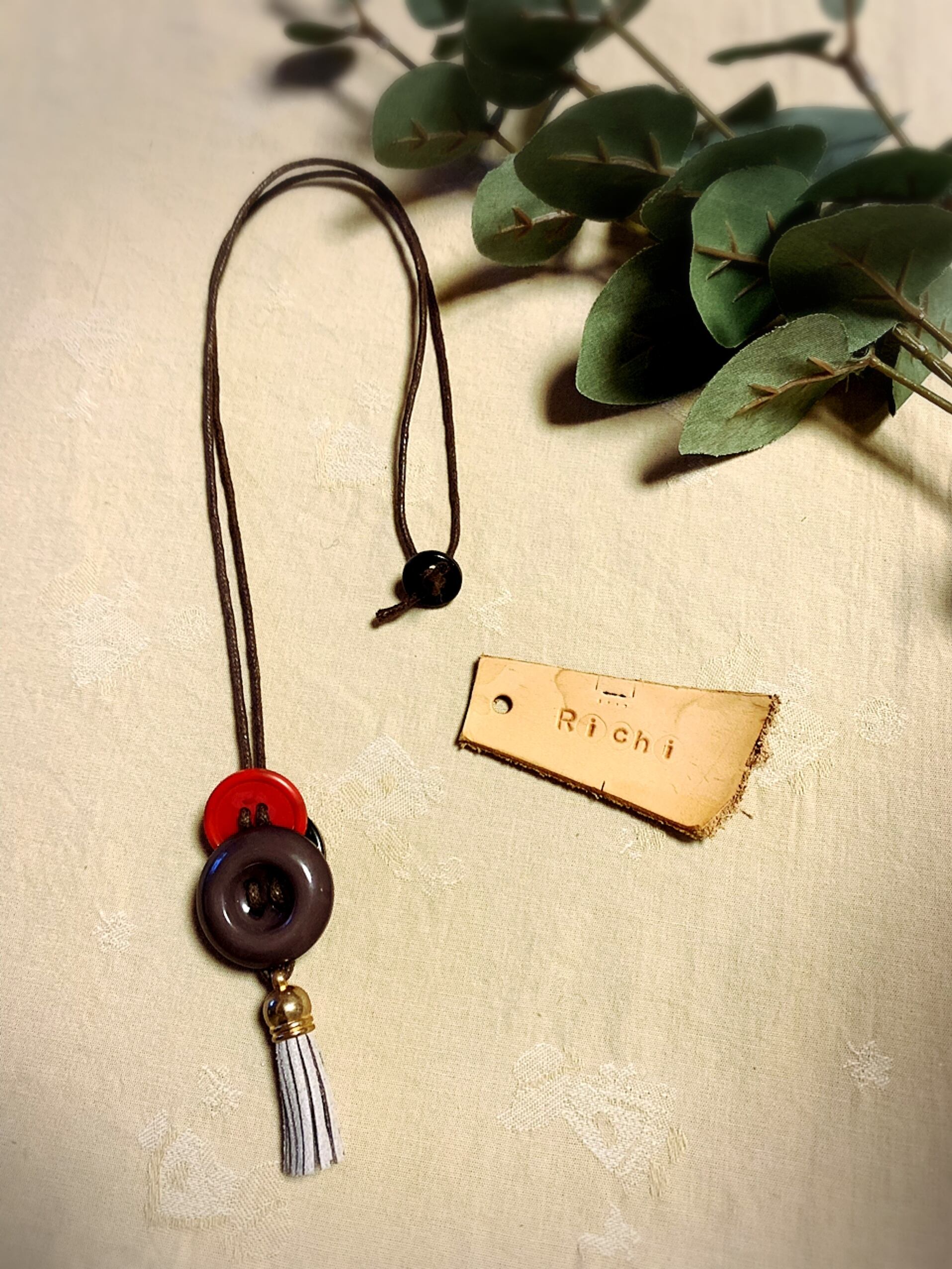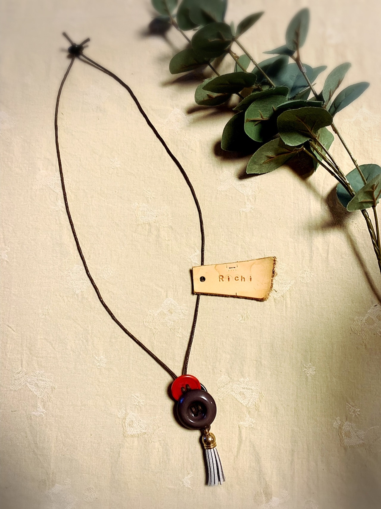 24のペンダントと似たデザインになりますが、 こちらは赤色ボタンがポイントになっています。 コーディネートのアクセントにぜひ。 首後ろには小さなボタンが一つ。