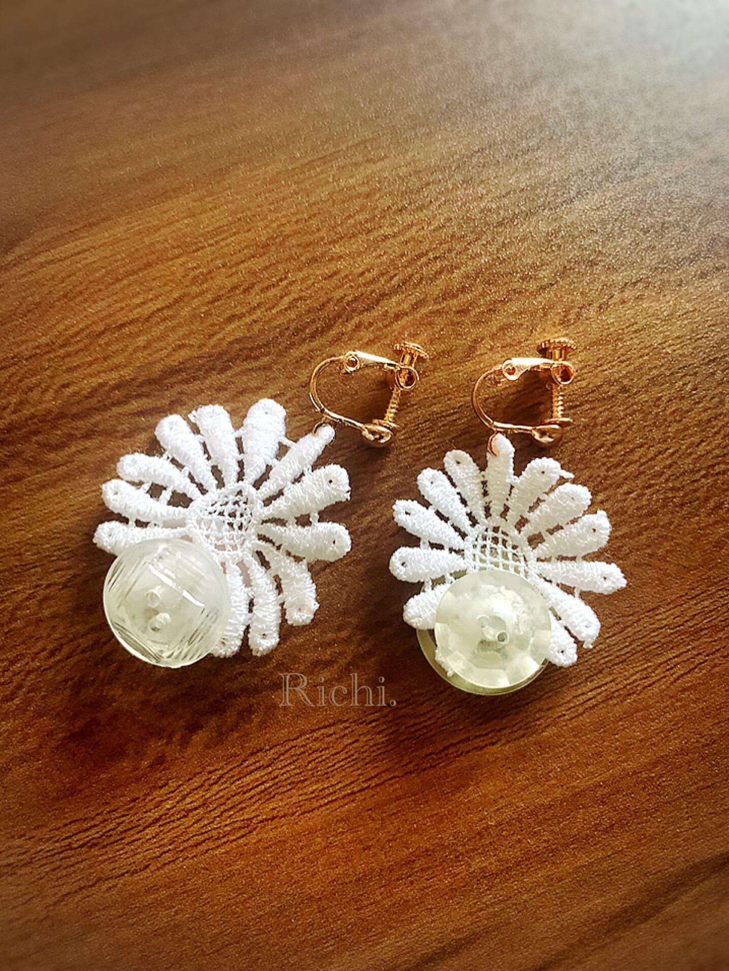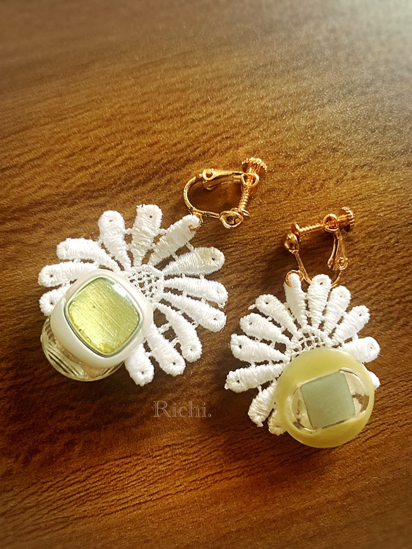 レトロレースとボタンの組み合わせです。 アイボリー系とクリアのボタンを前後に配置して、アシンメトリーに仕上げました。 愛らしく楽しめますっ