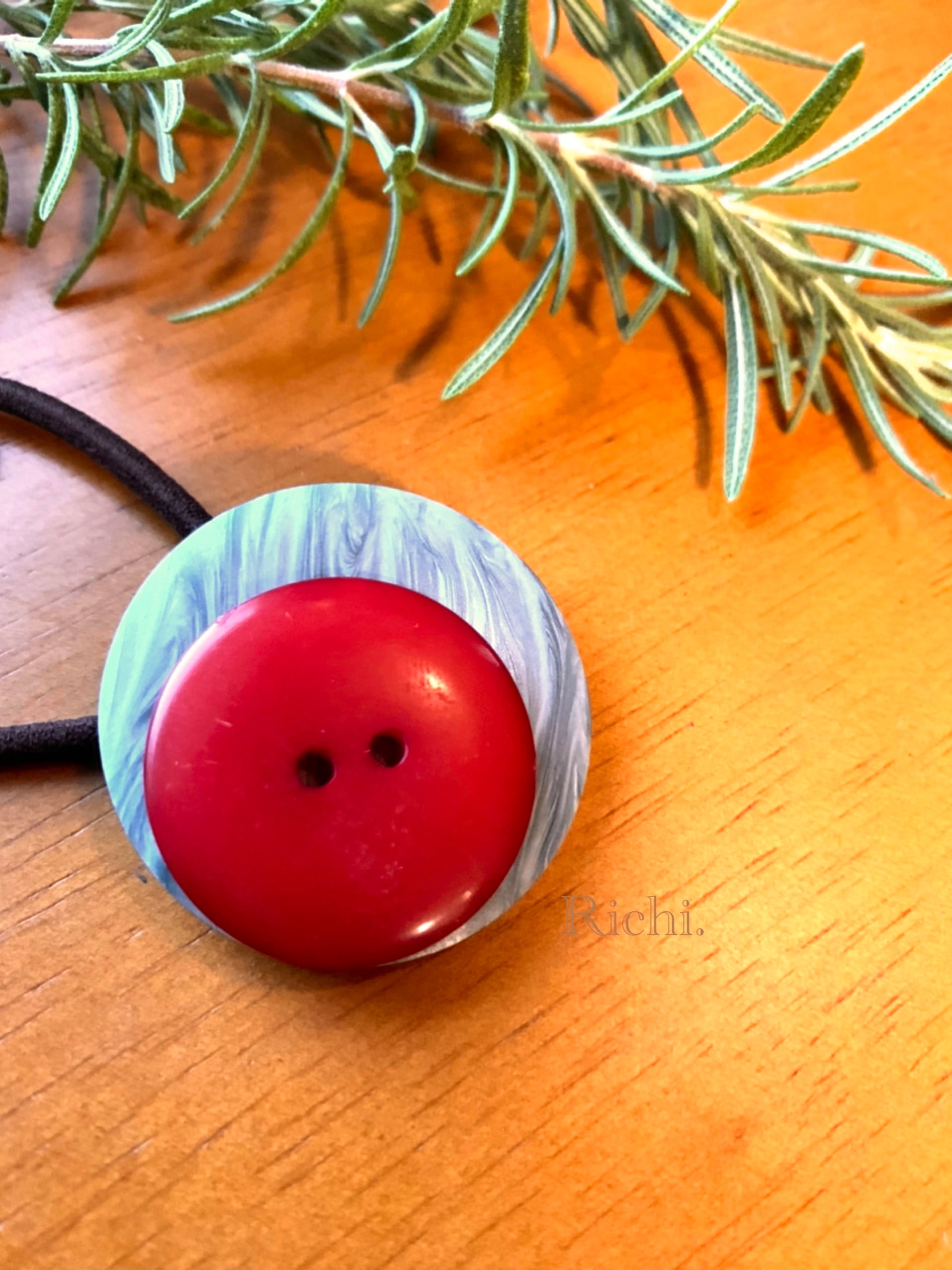 4cmの大きめマーブルブルーボタンと、真っ赤なレトロボタンを組み合わせました。