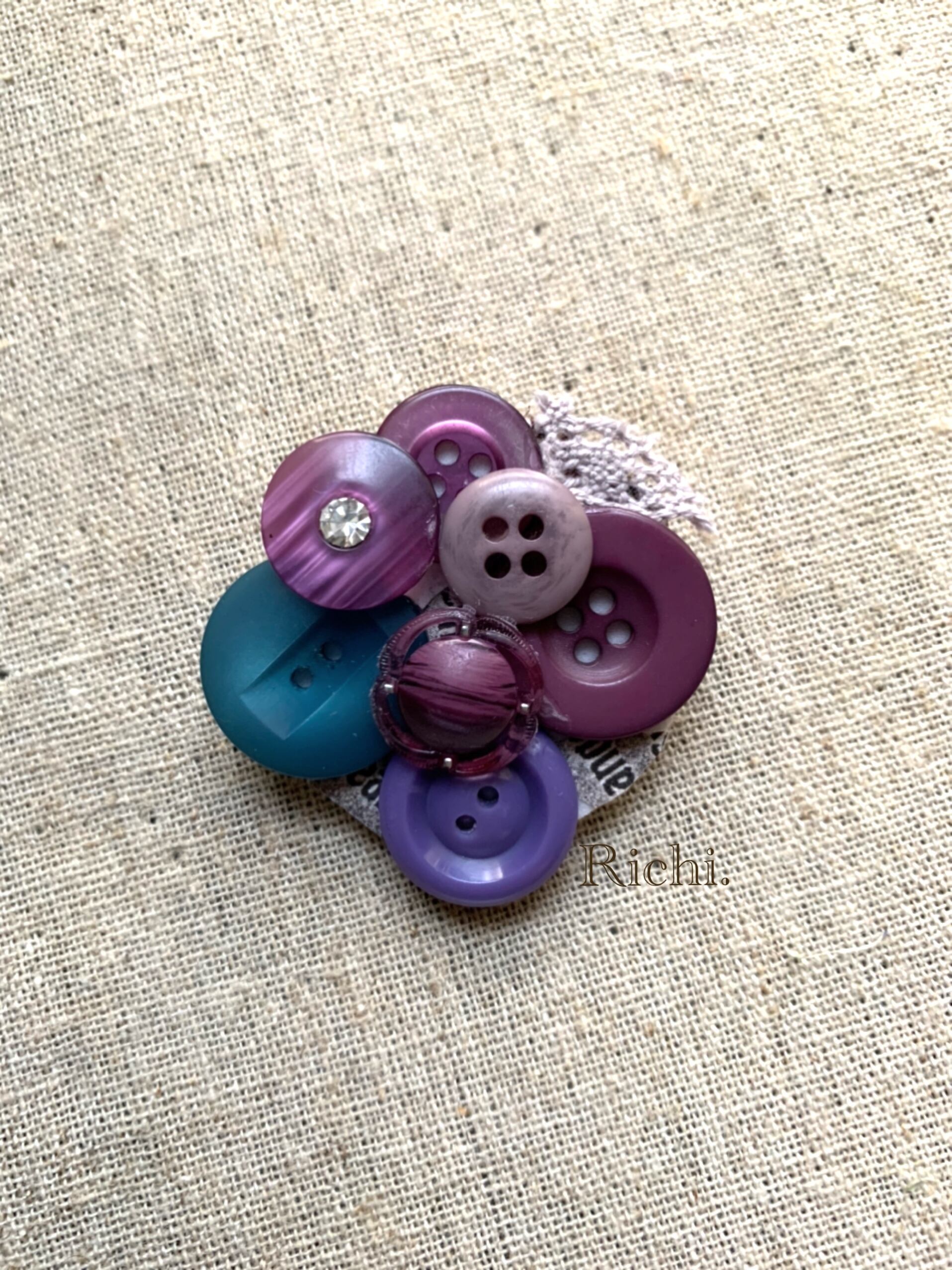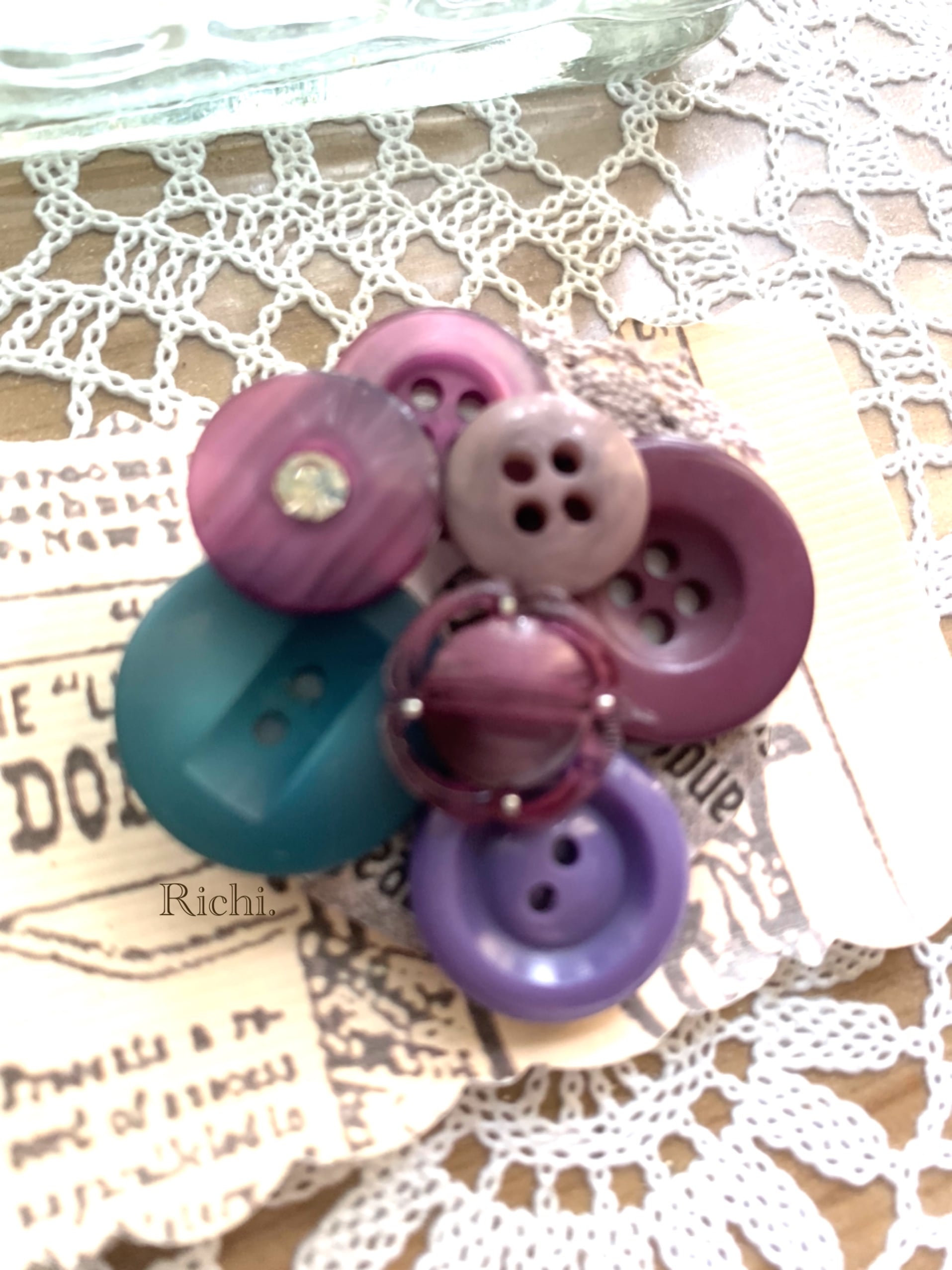 小さめrétroボタンをギュッとまとめて、ポイントにグリーンボタンと英字新聞でデザインしました。